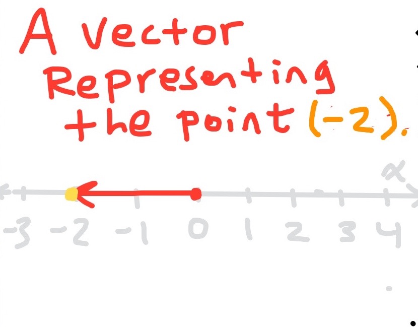 Now, as we progress in our study, we take a nuanced approach at parametric curves. First, I must explain that every point in space can be represented by a vector. This is the case for any n-dimensions of spa choose. For example, in one dimension, a point on the number line can be represented by a vector whose start point, its tail, sits at zero and whose end point, or tip, lies on the given point on the number line. The vector will have a length and a direction, the length being the distance travelled along the vector, and the direction in this case being left or right.In two dimensions, a point (x,y) would be represented by a vector whose tail lies on the origin (0,0) and whose tip extends to the point (x,y). Note: x,y can be any point, even (0,0) itself, in which case the vector would have zero length.